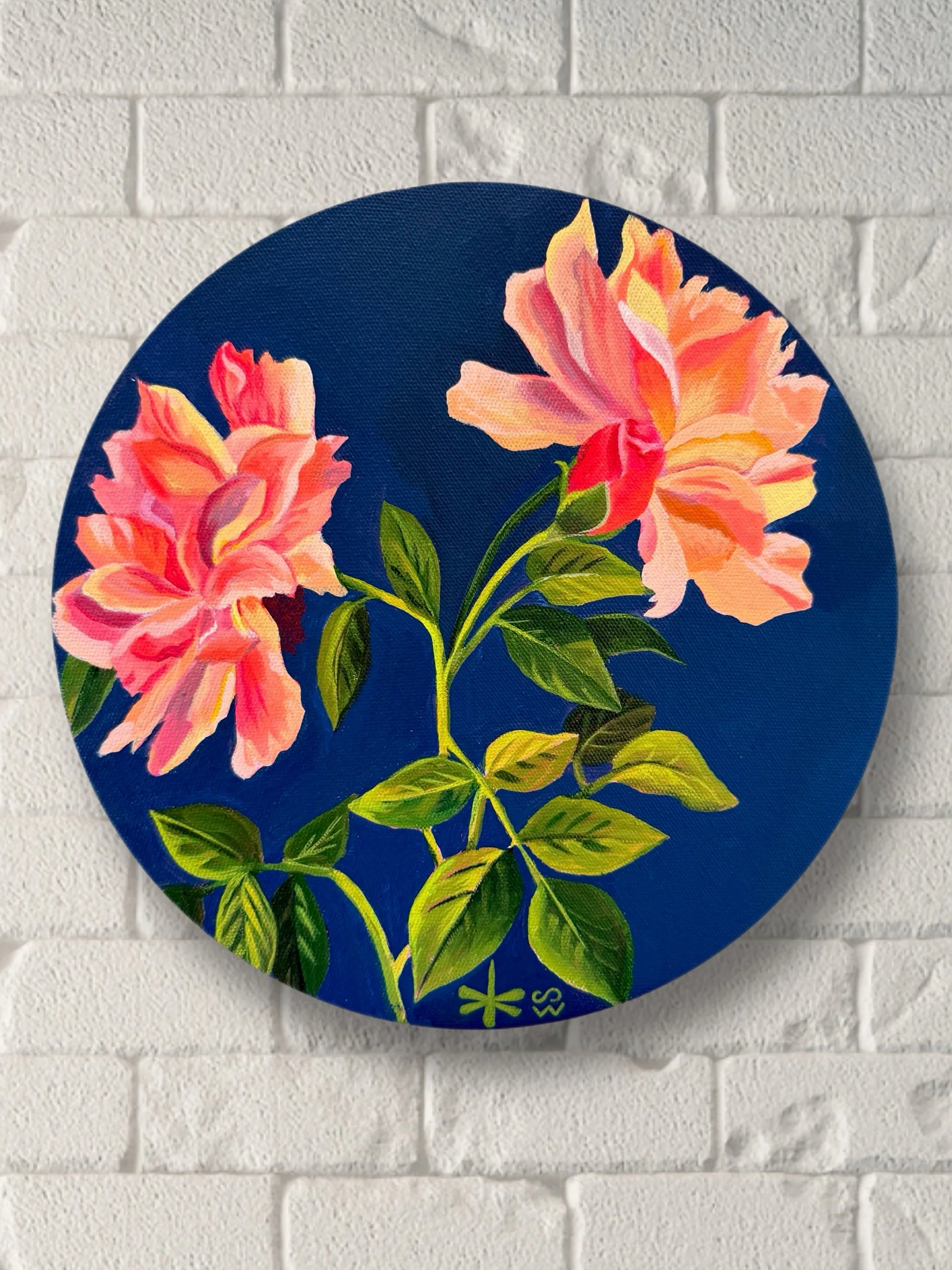 This year’s painting is titled “Roses at Night” — an acrylic piece on a 10” round canvas, created in honor of Willow and to support the incredible work of St. Jude Children’s Research Hospital.