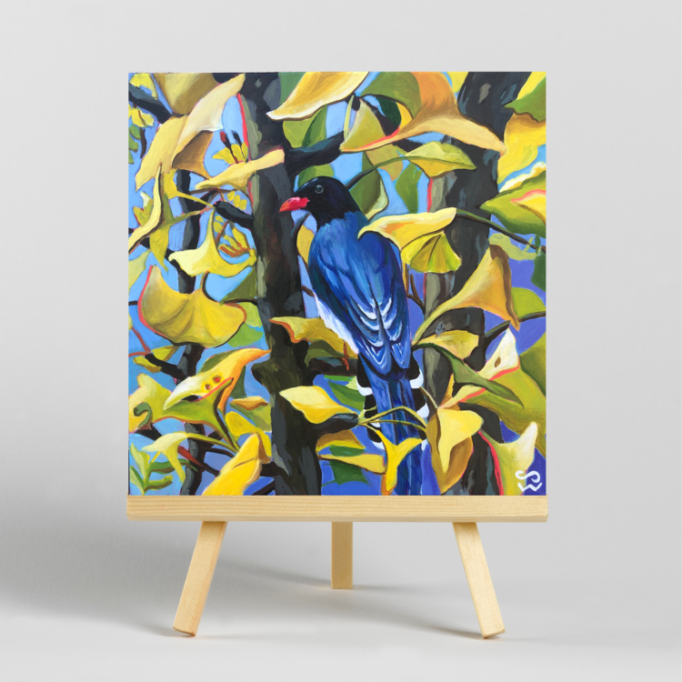 This blue magpie surrounded by bright yellow Gingko leaves, was the painting for the 3rd annual Levi fundraiser. It measured 16x16 inches and was created on gallery edge canvas. It was given away in 2020 and raised a total of $1220 for St. Jude Children’s Research Hospital.