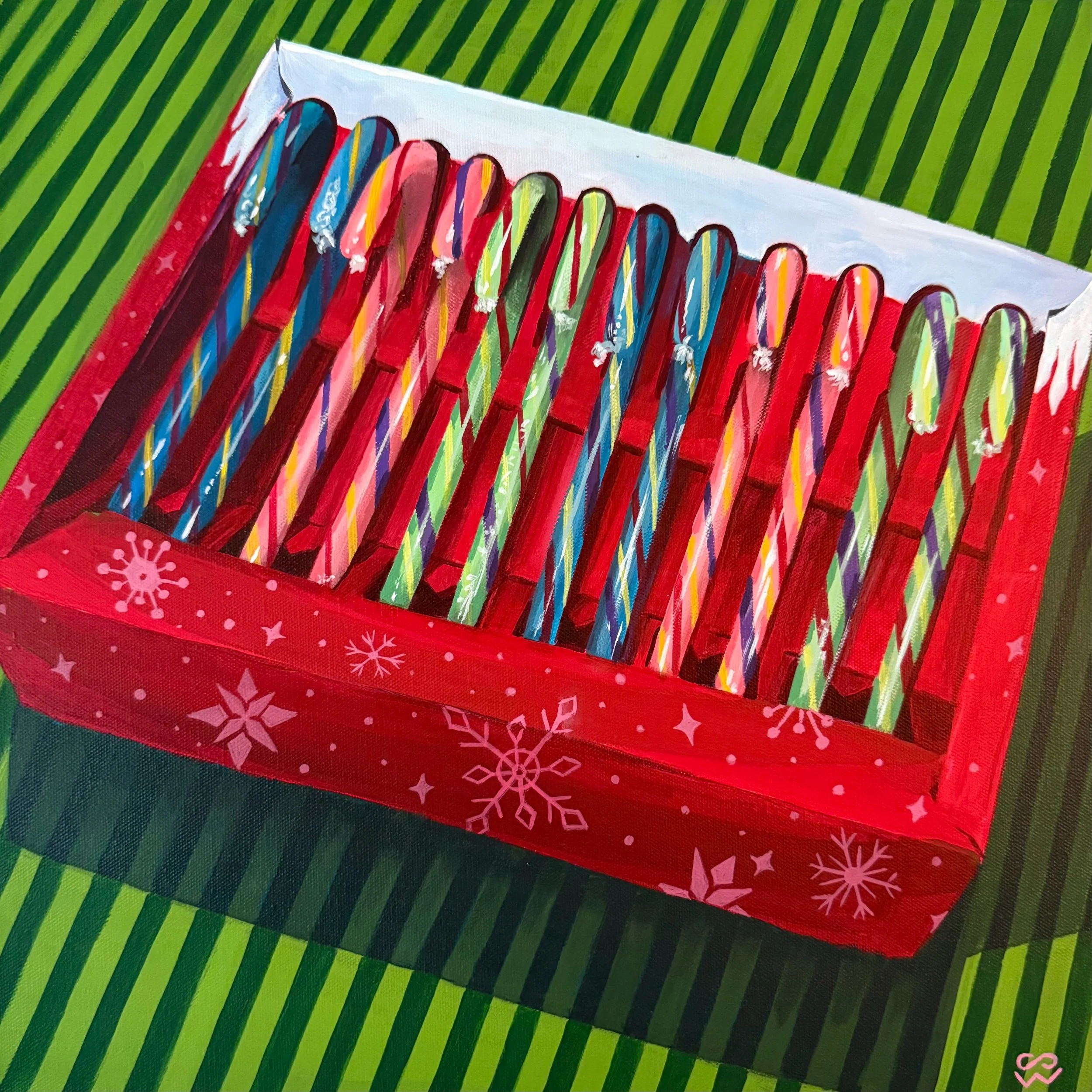 1 of 4 paintings from the 2025 Holiday Collection. Shipping within the U.S. or local porch drop off is included. Acrylic on 16x16” gallery edge canvas.